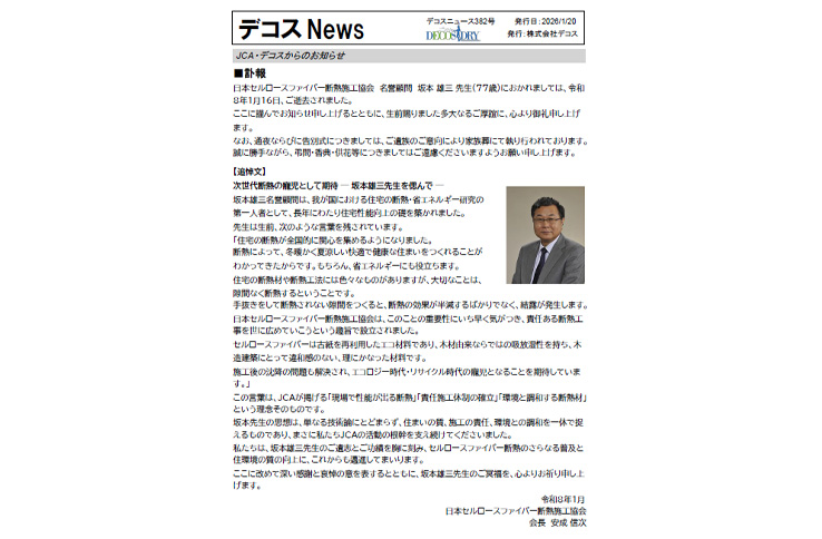 JCA設立25周年のご報告日本セルロースファイバー断熱施工協会(JCA)は、おかげさまで設立25周年を迎えました。